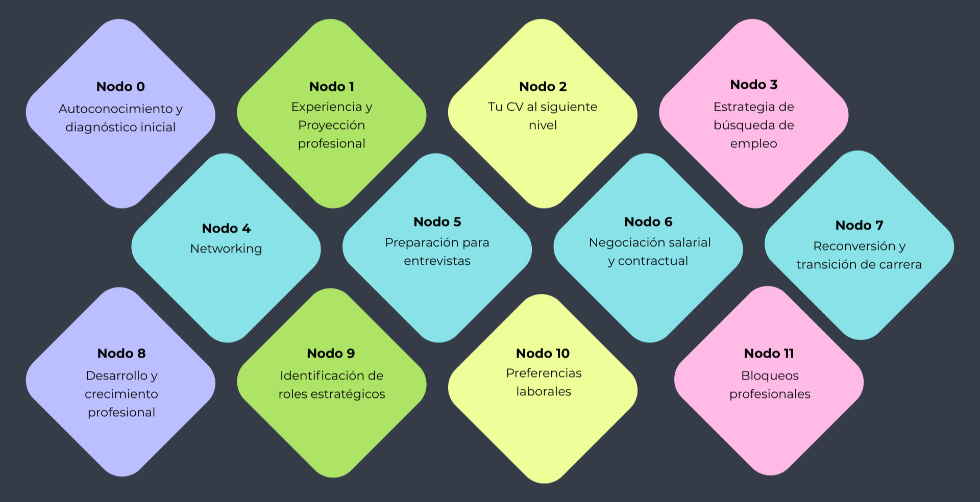 Analizamos tu empleabilidad de forma integral a través de 12 nodos que impactan directamente en tus oportunidades laborales.