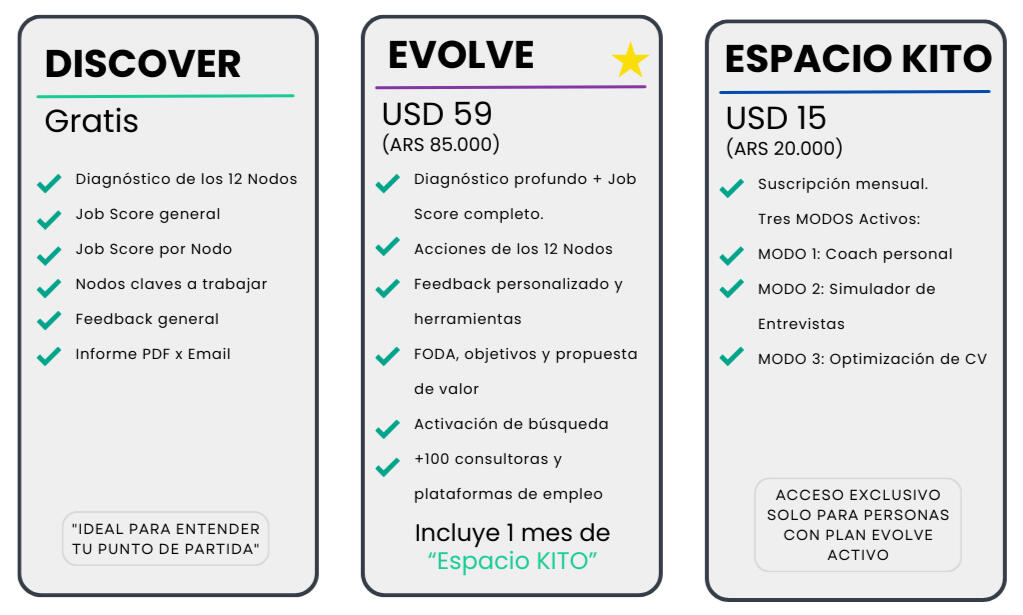 Vos elegís. Empezá gratis con Discover o accedé al plan completo con Evolve + acompañamiento de KITO