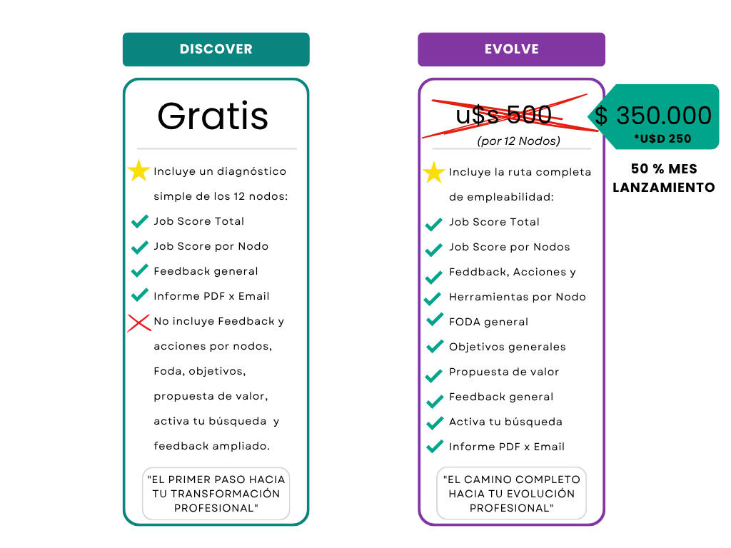 Hemos diseñado dos planes personalizados que se adaptan a tus necesidades, desde un primer diagnóstico gratuito hasta un plan de empleabilidad completo. Vos decidís por dónde empezar.