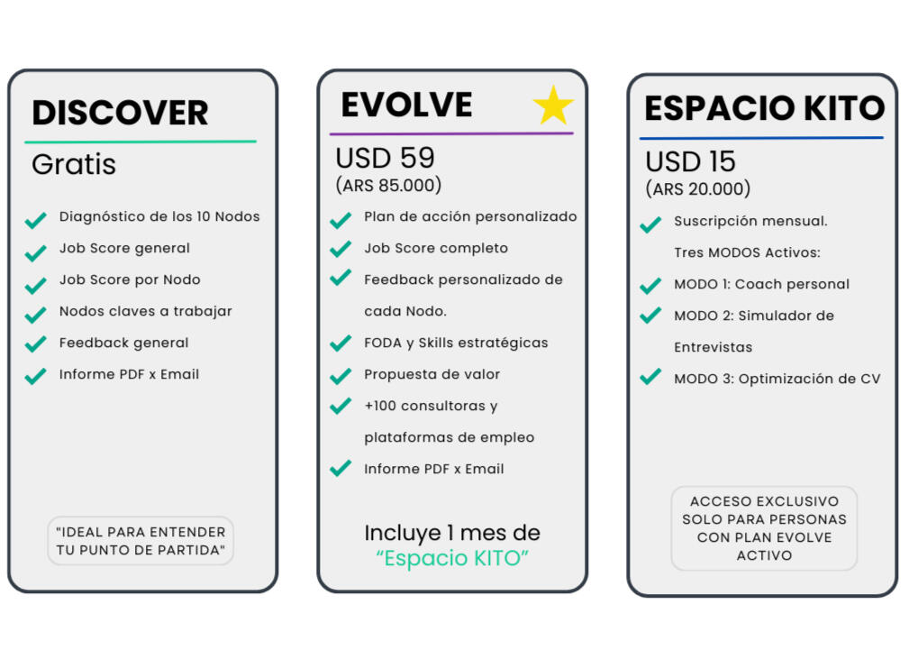 Vos elegís. Empezá gratis con Discover o accedé al plan completo con Evolve + acompañamiento de KITO